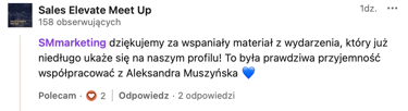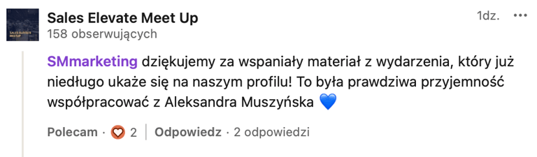 ”Aleksandra Muszyńska nie mogę się doczekać tych wideo i mega dobrze się z Tobą współpracowało. Tak dobra energia, uśmiech, poczucie humoru. Doskonale się przy Tobie czułam - to ważne kiedy wiesz że ktoś nagrywa.”